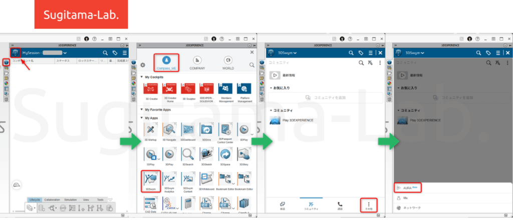 AURAは、独立したコマンドアイコンではなく、タスクパネルの中にある「3DSwym(コミュニティ)」アプリの中の奥まったところに隠れていました。