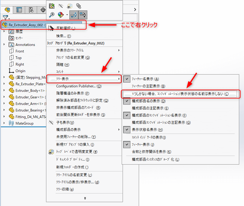 - デザインツリーの最上部のアセンブリ名(または部品名)を右クリックします。