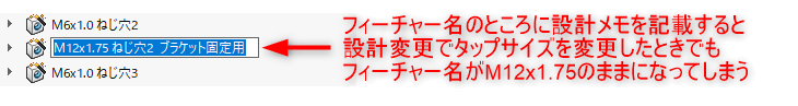 フィーチャー名に設計メモを記載してしまうと、フィーチャーを変更したときに、フィーチャー名が変更されずそのままになってしまうからです。