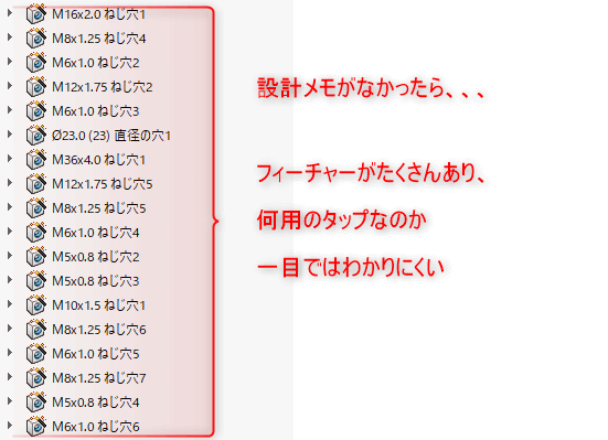 例えば、複数ある穴フィーチャーに「○○部品取付用」とか、「○○部材と穴位置合わせのこと」など、設計メモを残しておけば、設計者以外のユーザーにも、設計情報を一目で伝えることができます。