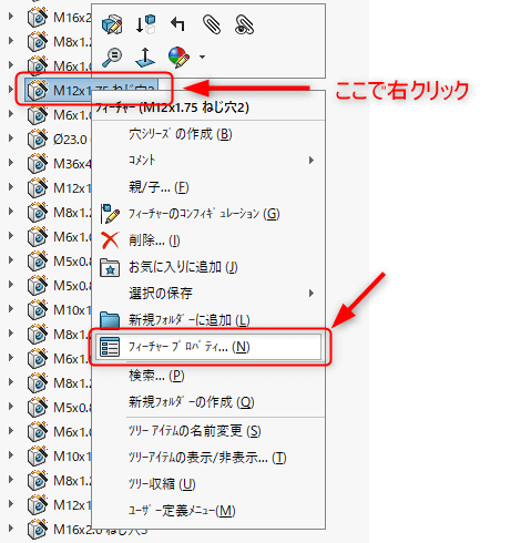 デザインツリー内のフィーチャーを右クリックし、「フィーチャー プロパティ」を選択します。