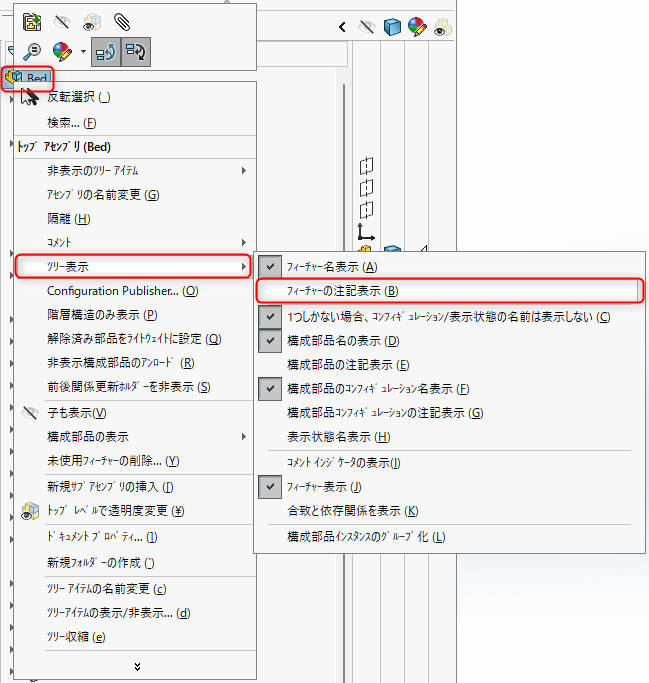 デザインツリーの最上部を右クリックし、「ツリー表示」から「フィーチャーの注記表示」にチェックを入れます。