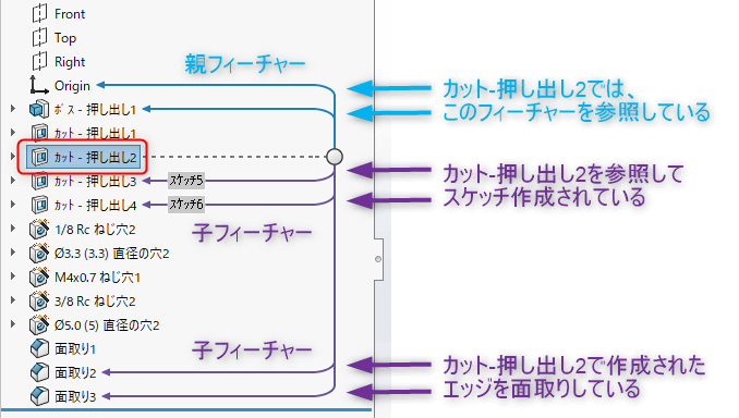 SOLIDWORKSのフィーチャーは、前のフィーチャー(親)を参照して作成されることが多く、この親子関係(参照関係)が設計の安定性を左右します。