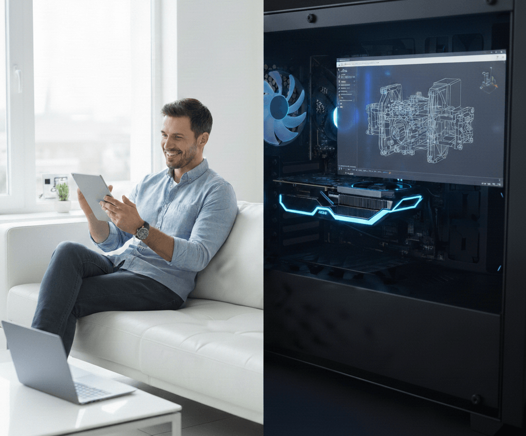 • 出張先や会議室での「その場修正」: 高価なモバイルワークステーションを持ち運ばなくても、一般的なノートPCで設計変更の検討やレビューができます。